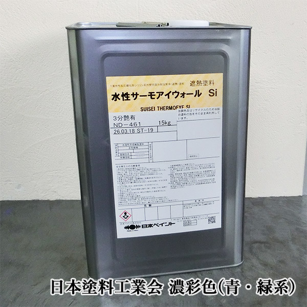 - > 水性サーモアイウォールSi 濃彩色(青・緑系) 15kg 約88~107平米/1回塗り